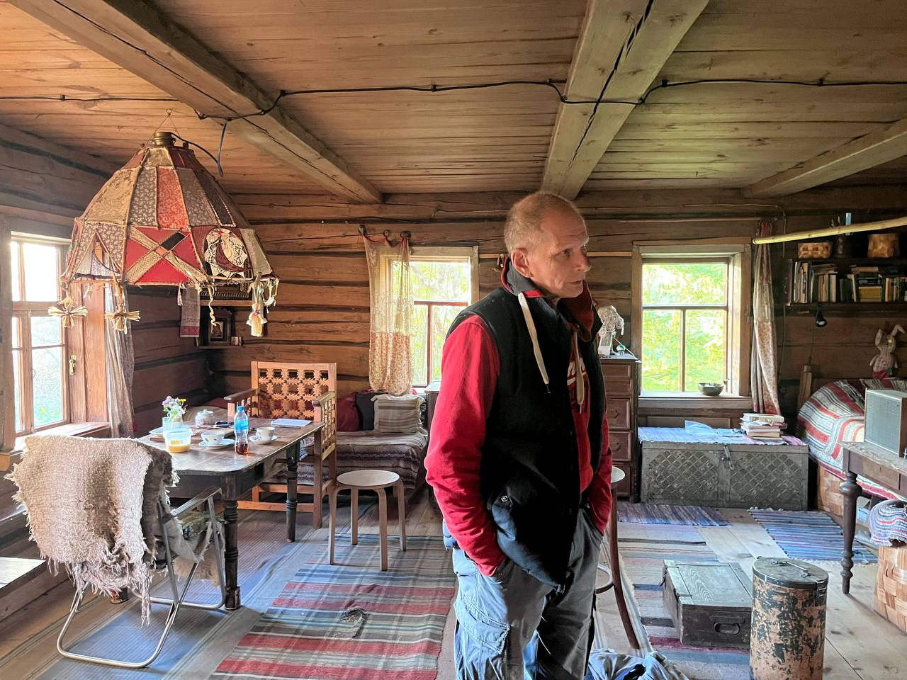 Валентин привел дом-призрак в порядок. Сейчас это чистая, хоть и крошечная изба с заново выстеленным полом и новой печью. Рядом Карелин потихоньку строит гостевой домик — со стрельчатыми окнами, рамы для которых он спас при ремонте Петровского путевого дворца в Москве. Обстановка в избе напоминает быт волшебника из фильма «Обыкновенное чудо» — тюлевые занавески, люстра странной формы, потертые откосы дверей. Еще бы манишку под растянутый свитер — и Карелин превратится в Янковского.