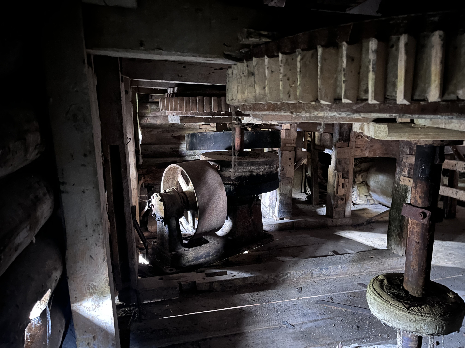 На вид мельница — большая бревенчатая изба, только половина ее нависает над рекой. Внутри она похожа на театральное закулисье: лестницы, люки, перила, задвижки на цепях, загадочные механизмы с шестеренками. «Товарищи помольцы! Здесь курить не разрешается», — гласит надпись на стропиле чердачного этажа: мучная взвесь взрывоопасна. В той половине здания, которая стоит на твердой земле, стены местами покрыты газетой, на которые клеились обои — раньше в этих комнатах жила семья мельника. В одной из газет новость об убийстве Сергея Кирова: последний раз обои переклеивали в 1934-м.