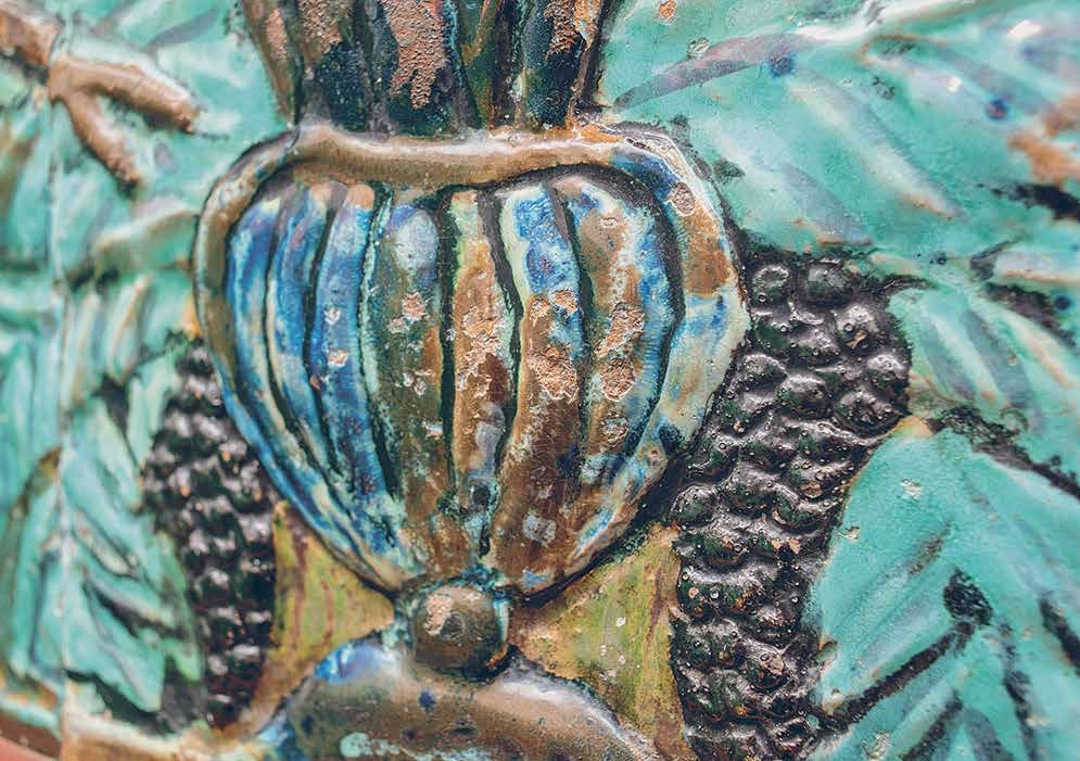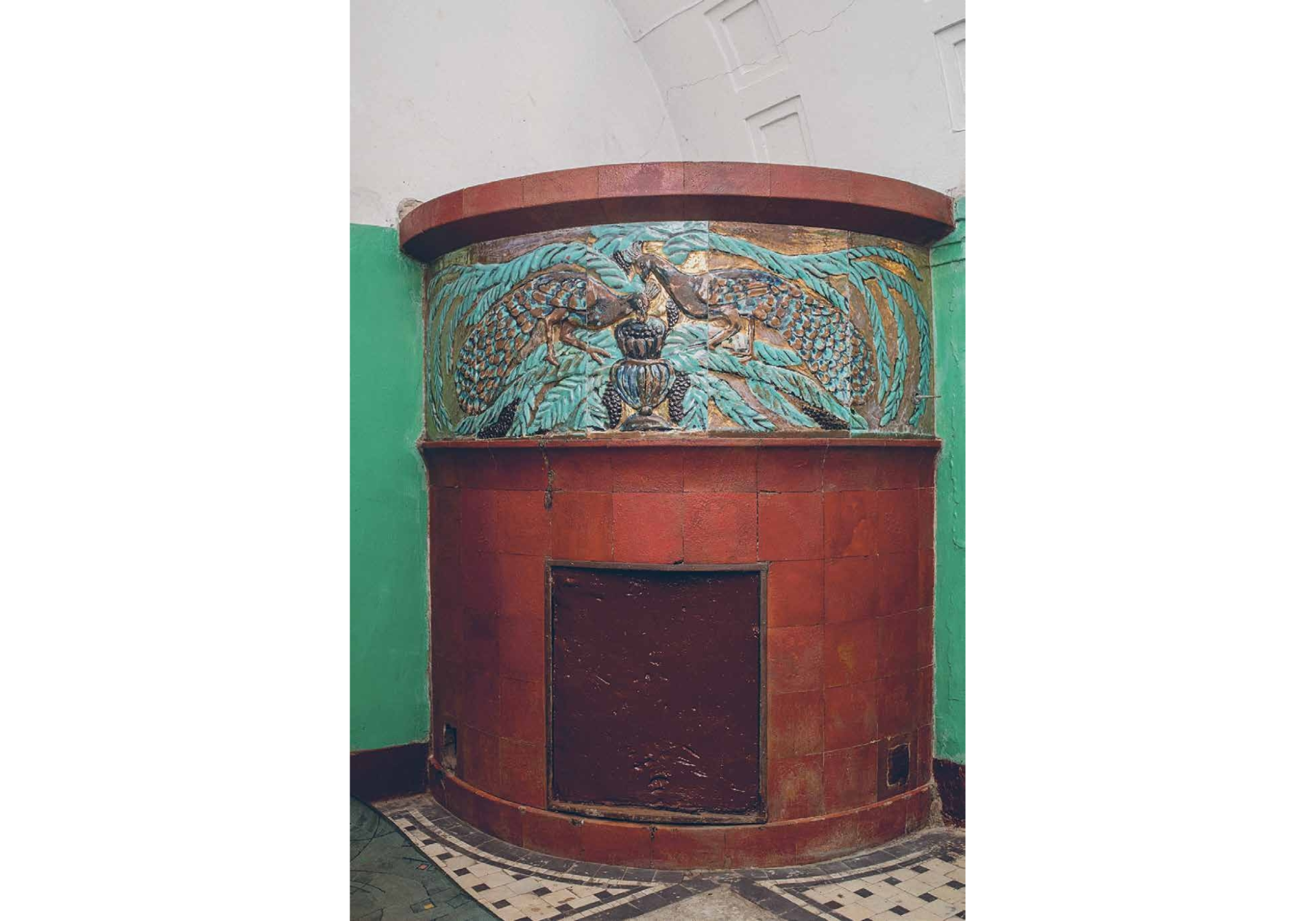 Я ходила мимо него не меньше десятка раз и не замечала, что он вообще-то под краской. Камин венчало относительно чистое майоликовое панно с двумя павлинами на золотом фоне — птицы перетягивали все внимание на себя, и вот изразцы болезненного серо-зеленого цвета уже не так бросались в глаза. Когда-то изразцы камина были закрашены черным, и даже исследователи наследия «Гельдвейна-Ваулина» считали, что этот цвет родной. И вот в январе 2021 года Максим нашел место, где поздняя серо-зеленая краска отслоилась от керамики. Из-под нее выглядывал черничный изразец! Я взялась согласовывать очистку в Комитете по охране памятников и волновалась как никогда: такой камин в городе один, а панно на нем хоть и имеет повторения, но сделано по рисункам самого Михаила Врубеля. Казалось, что если мы отмоем его, то круче уже объекта не найти (потом, конечно, нашли). Комитет отправил сотрудников оценить ситуацию и вскоре прислал положительный ответ. Фух.
