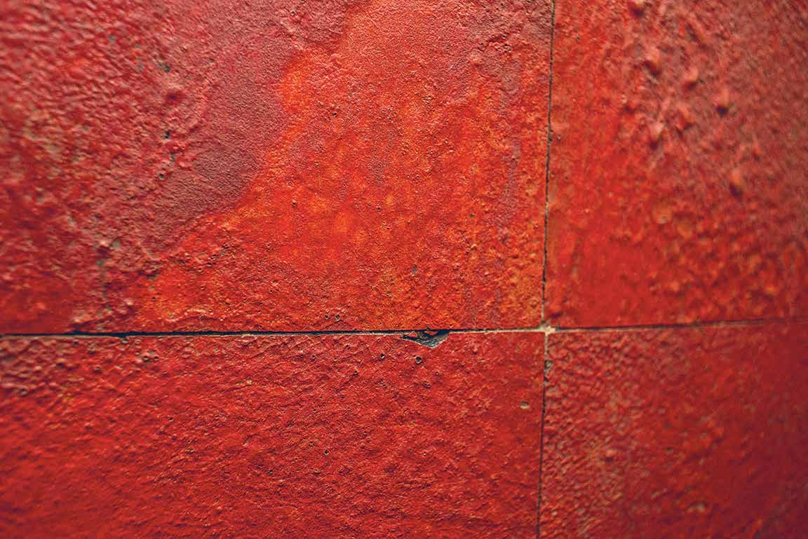 На тестовую расчистку мы с Максом принесли три чуть-чуть разных по эффекту, но одинаково безопасных для керамики состава — хотели понять, какой из них лучше сработает в холодной парадной. Первая же проба показала, что изразцы окрашены двумя тонкими слоями и что на самом деле они не черничные, а алые, как раскаленная чешуя Змея Горыныча. А еще изразцы фактурой напоминают кожуру грейпфрута — рельефную, с кратерами и холмами. Для нас это значило, что придется приложить примерно в три раза больше усилий — гладкий изразец моется несравнимо быстрее. Но так только интереснее: гладких каминов много, а такой у команды в портфолио один.