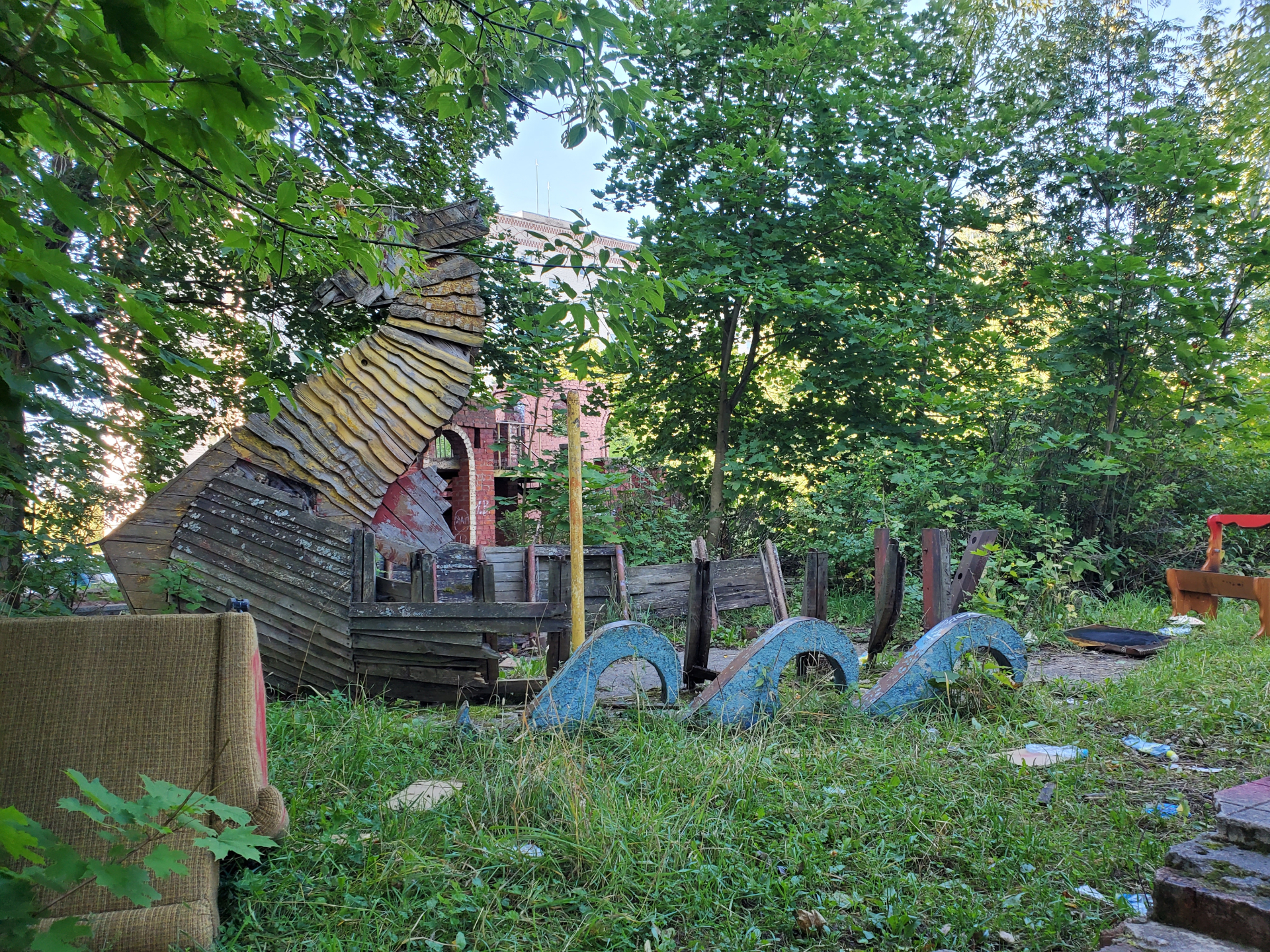 Я ловлю себя на том, что многие площадки, неухоженные и брошенные, тем не менее, вызывают у меня большую эмпатию. Именно неодушевленные предметы: стойки для сушки белья, старые пошатнувшиеся турники, крыши сарайек, двери гаражей, покосившиеся качели. Мне они кажутся похожими на обиженных детей. Мое сознание достраивает и придумывает им судьбу, историю и предназначение.