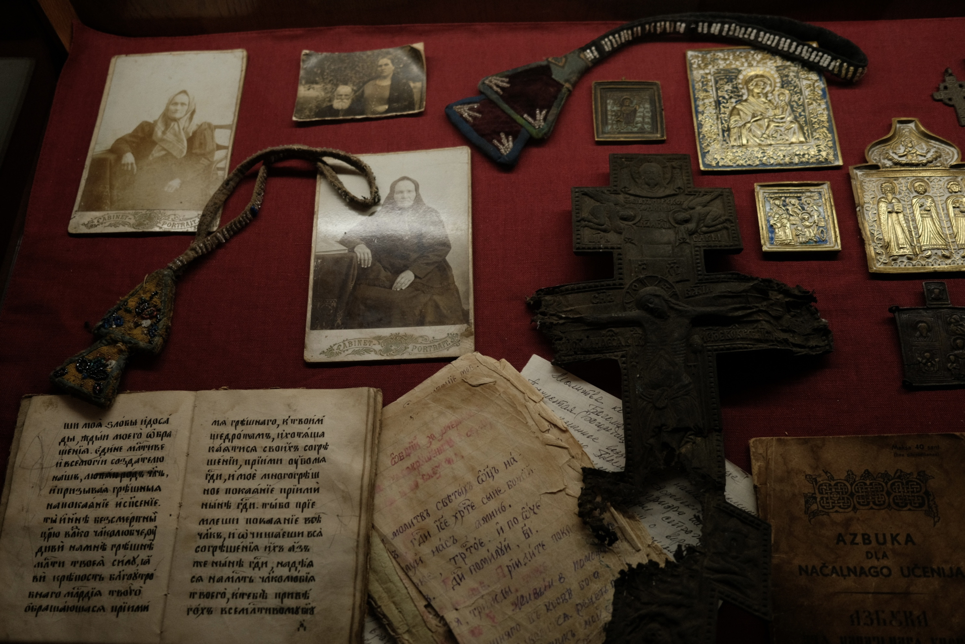 На одной из полок стоит запыленная бутылка «Вдовы Клико» времен оккупации, когда в доме жил немецкий офицер. В соседних витринах — старинные книги, фотографии старожилов, подписные ламповские прялки и кожаные четки — лестовки. Часть экспонатов перекочевала из дома дяди Жени, много лет собиравшего старинные артефакты. Другие предметы принесли ламповцы и жители окрестных населенных пунктов.